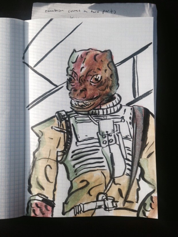 Daily Drawing 124 May 4, 2015 Today is Star Wars day, so I drew the best bounty hunter, Bossk. He’s a lizard person in an astronaut suit! What’s not to love? Share this: Click to share on X (Opens in new window) X Click to share on Facebook (Opens in new window) Facebook More Click to email a link to a friend (Opens in new window) Email Like Loading... Related